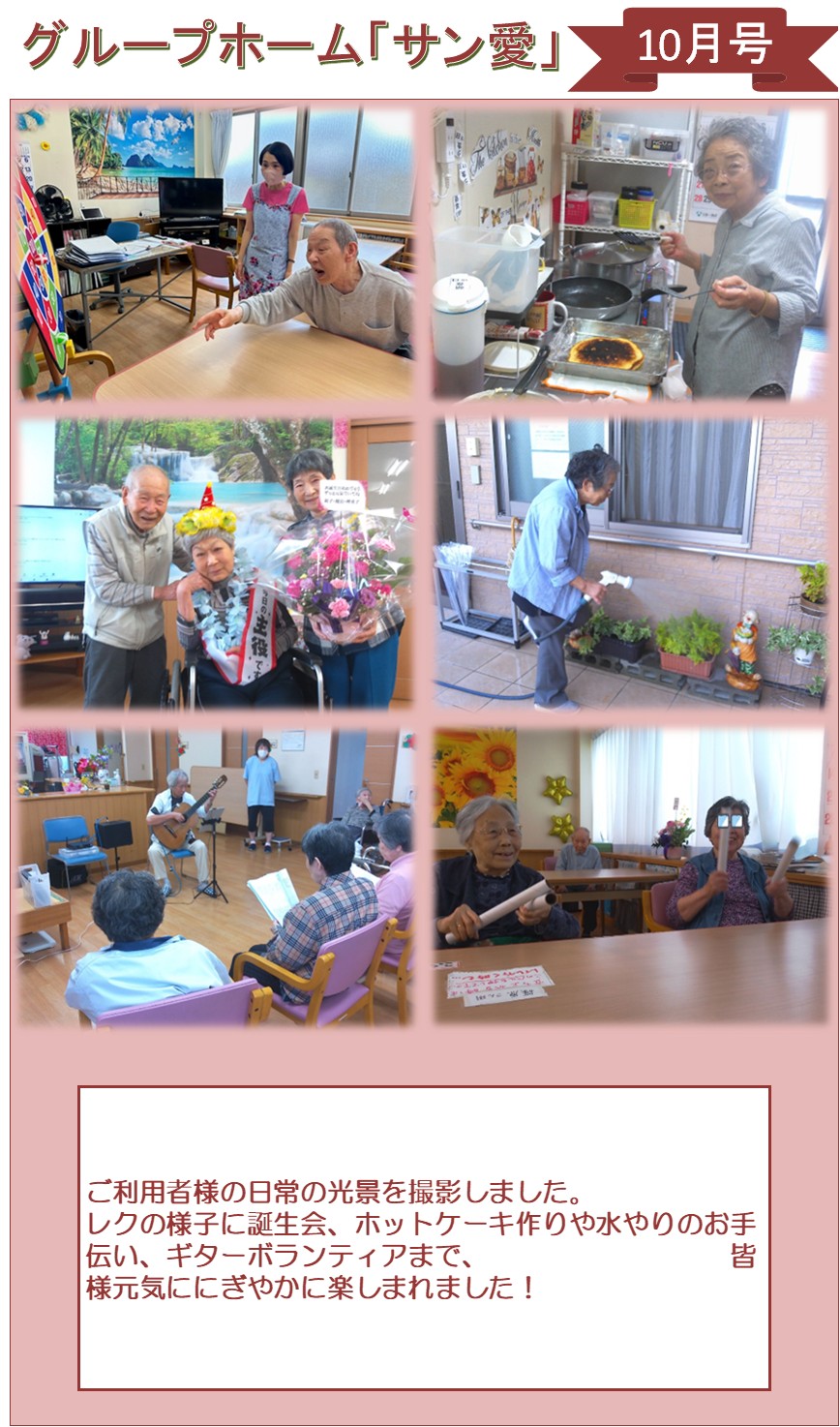 施設の特徴グループホーム「サン愛」では、利用者様が家庭に近い環境で、心身の状態を穏やかに保てるようにスタッフが働きかけ、過去に体験したことがある役割をみんなで行い、潜在的な能力を呼び起こすようにお手伝いさせて頂きます。